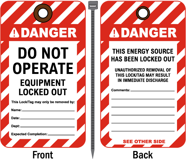 Danger Do Not Operate Equipment Locked Out This Lock/Tag May Only Be Removed By: Name:__ Date: __ Dept:__ Expected Completion: __ Back Reads: Danger This Energy Source Has Been Locked Out Unauthorized Removal Of This Lock/Tag May Result In Immediate Discharge Comments:__ See Other Side