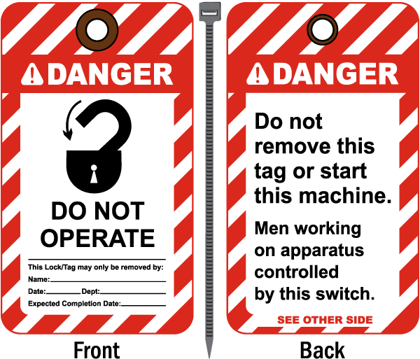 Danger Do Not Operate This Lock/Tag May Only Be Removed By: Name: __ Date: __ Dept.: __ Expected Completion Date: __ Back Reads: Do Not Remove This Tag Or Start This Machine. Men Working On Apparatus Controlled By This Switch.