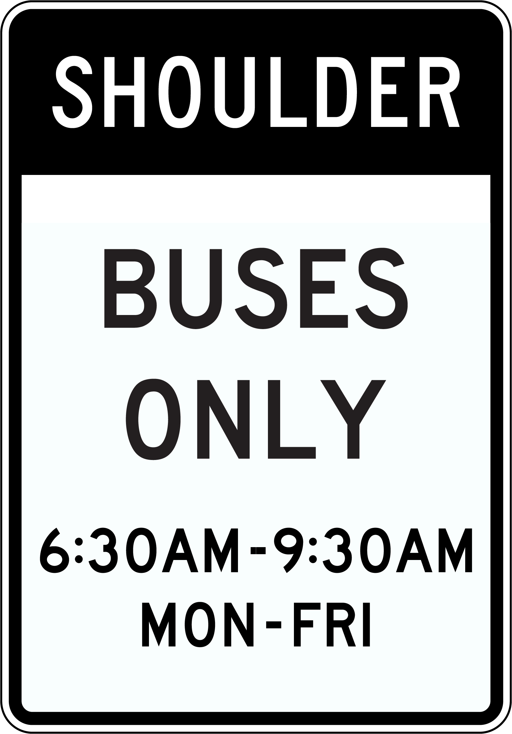 This Shoulder Bus Only Sign designates the shoulder lane for exclusive bus use, allowing public transit vehicles to bypass congestion and maintain scheduled routes. It enhances efficiency by providing buses with a dedicated travel path in heavy traffic areas. Commonly used on highways and urban roads, this sign helps improve public transit reliability.