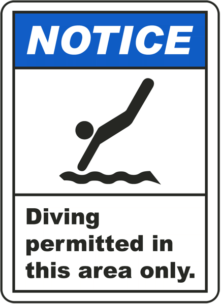 The New Jersey Diving Permitted Sign has informational messages for property and swimming policy concerns. The New Jersey Diving Permitted Sign is a useful tool to help protect the health and safety of others in pool and swimming areas, and is not a substitute for necessary protective measures for lessening or eliminating hazards. This sign complies with N.J.A.C. 8:26-5.5.