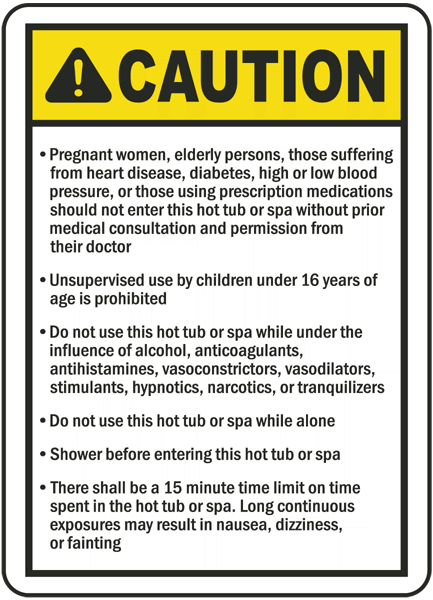 "Pregnant women, elderly persons, those suffering from heart disease, diabetes, high or low blood pressure, or those using prescription medications should not enter this hot tub or spa without prior medical consultation and permission from their doctor."