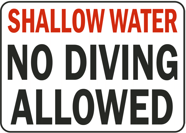 The South Carolina No Diving Allowed Sign has informational messages for property and swimming policy concerns. The South Carolina No Diving Allowed Sign is a useful tool to help protect the health and safety of others in pool and swimming areas, and is not a substitute for necessary protective measures for lessening or eliminating hazards. This sign complies with S.C. Code Regs. 61-51. "SHALLOW WATER" is 4" tall and "NO DIVING ALLOWED" is 6" tall.