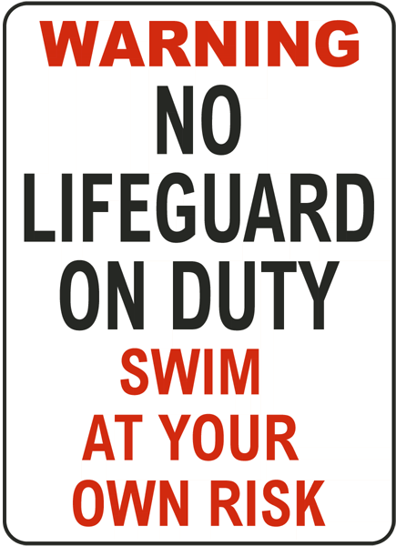 The South Carolina No Lifeguard Sign has informational messages for property and swimming policy concerns. The South Carolina No Lifeguard Sign is a useful tool to help protect the health and safety of others in pool and swimming areas, and is not a substitute for necessary protective measures for lessening or eliminating hazards. This sign complies with S.C. Code Regs. 61-51. "WARNING" and "SWIM AT YOUR OWN RISK" text is 4". "NO LIFEGUARD ON DUTY" is 6".